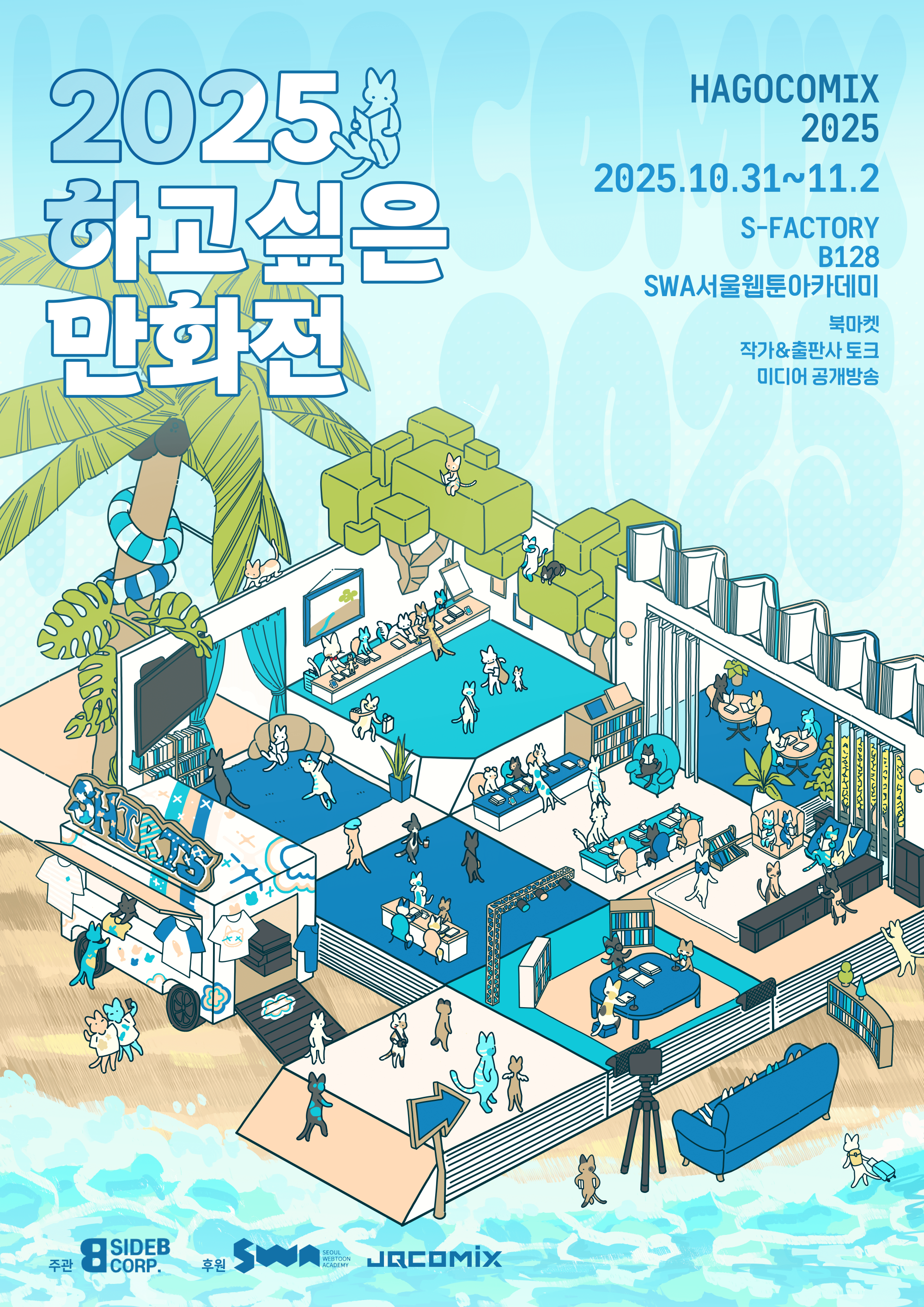 작년에 이어 올해도 만화 회사 사이드비(sideB)가 주최하는 출판만화 북페어 〈하고싶은 만화전〉(이하 〈하만전〉)이 열립니다. 오는 31일(금)부터 내달 2일(일)까지 3일 동안 열리며, 12시부터 19시까지 별도의 초대권 구매 없이 무료로! 자유롭게! 입장할 수 있습니다. (단 1일 토요일은 17시 입장 마감)