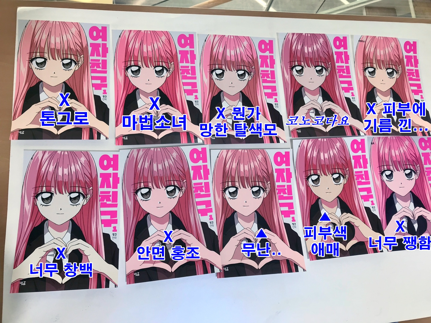 🍇H편집자: 지난 금요일에 본사에 들어온 『여자친구』를 확인하고 저 ‘진짜로’ 눈물을 흘렸습니다. 『여자친구』를 편집하면서 디자이너님과 저를 정말 힘들게 한 것 중 하나. 그것은 바로 별색 팬톤806C… 핑크머리 한나의 머리색을 더욱 주인공답게 만들어주기 위해 별색을 첨가했고 그 외 다른 인물들의 머리색, 피부, 배경 등에도 섞어서 색을 냈답니다. 정확한 색감을 맞추기 위해 12장의 샘플을 내어보는 것부터 좀 광기였는데(근데 뭔가 벽보 같지 않나요? 무소속 10번 최한나 느낌. 공약 “여자친구를 만들어드리겠습니다!!”) 이중에서 이거다 싶은 하나, 그 이상적 색감을 구현하고 싶었으나 한 장의 샘플을 인쇄하는 것과 다르게 실제 대량 인쇄에선 좀처럼 쉬운 작업이 아니더라고요… 생전 처음 감리를 두 번 다녀오기로 결정했고(“될 때까지 할 겁니다”) 하루종일 인쇄소에 있다가 돌아왔답니다. 그러니 『여자친구』 많이 사랑해주시고 예뻐해주세요!
