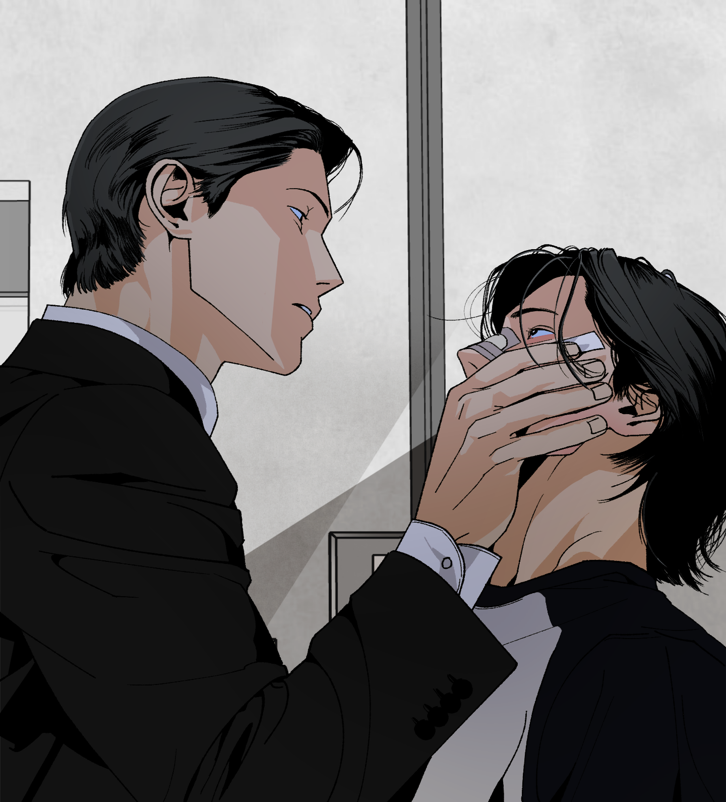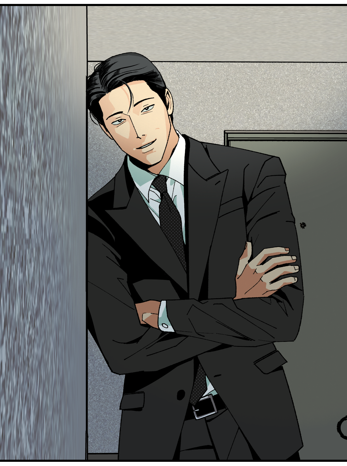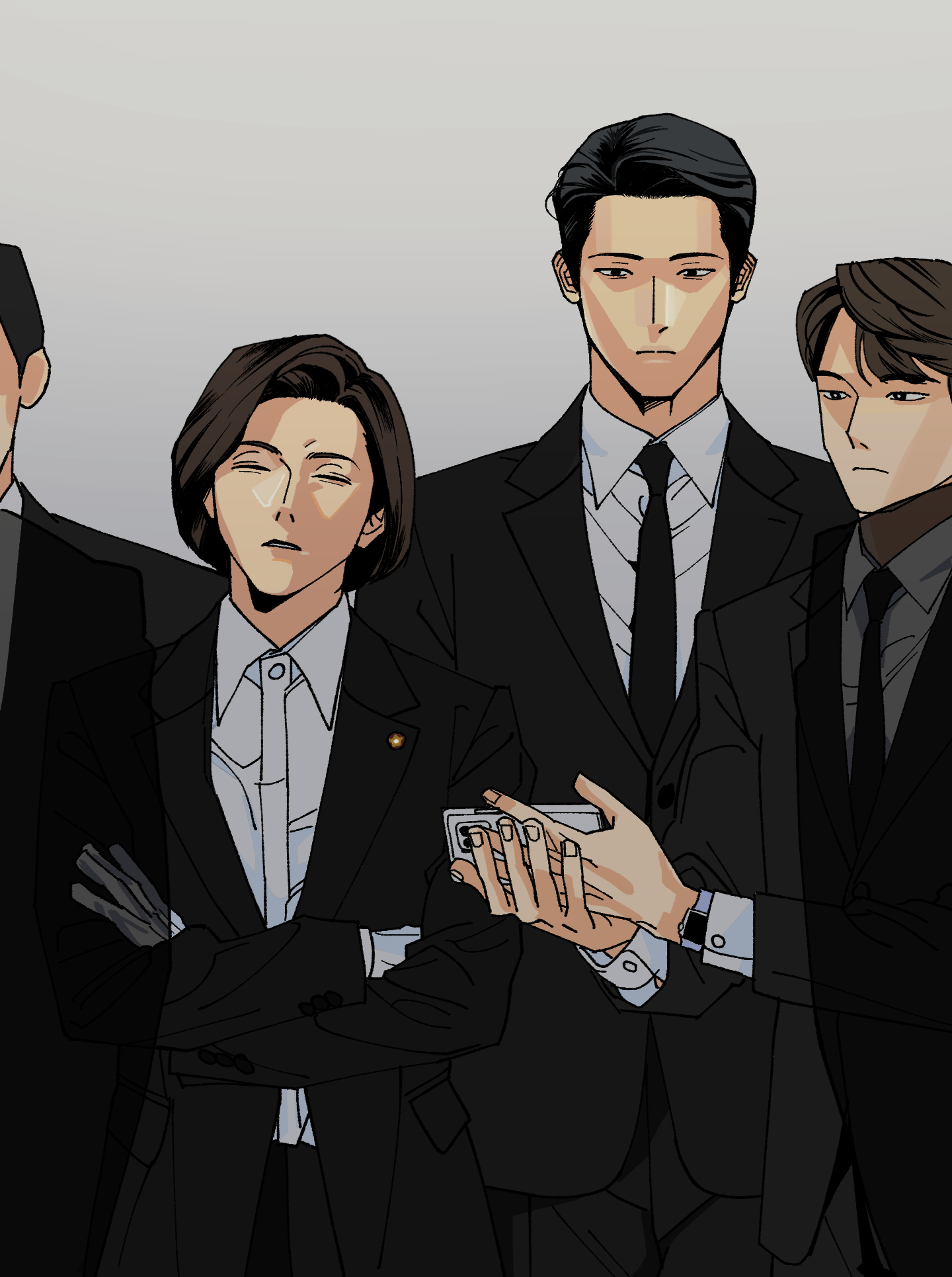 주말: 제가 조금 힘을 줘서 연출한 부분을 몇 개 고르자면, 작중 인철이 모시는 국회의원 이명선에 관한 것이 많습니다. 잠깐의 등장만으로도 압도하는 포스가 있어야 해서 말투에도 신경을 쓰고 있고, 비주얼적으로는 대사를 가리면 이들이 국회의원인지 조직폭력배인지 알 수 없는 분위기를 조성하려 하고 있습니다. 1화의 현충원 장면이 주인공 인철의 첫 등장이기도 해서 매우 중요했는데, 이 장면은 영화 〈신세계〉 와 〈대부〉의 장례식 장면들을 생각했습니다. 또 의원님과 부하 직원이 함께 나올 때는 되도록 강한 색은 모두 의원님에게 집중시키고, 보좌진은 최대한 무채색 계열의 옷을 입히고 있습니다. 의원님과 있을 때엔 직원들에게 자아가 없는 느낌을 주고 싶어서요. 그래서 지금까지는 의원실 직원 중 유일하게 권수(인철의 선임)만 의원님 옆에서 색이 있는 수트를 입고 있습니다.