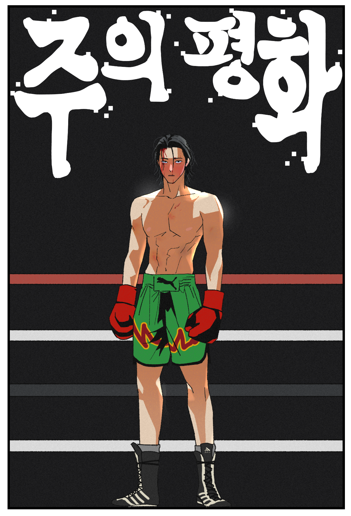 주말: 평화는 제가 이 만화를 구상하던 아주 초기에 모든 것이 바로 떠오른 캐릭터였습니다. 사실상 코어라고 할 수도 있을 정도로 존재 자체가 중요한 캐릭터인데요, 그래서인지 복싱선수라는 직업도, 말수가 별로 없는 성격도, 예쁘장한 얼굴과 그렇지 못한 취향도, 생각 없이 기른 듯한 머리 스타일도, 아직 풀리지 않은 과거사와 심지어 ‘안평화’라는 이름까지 모두 거의 한번에 만들어졌어요.