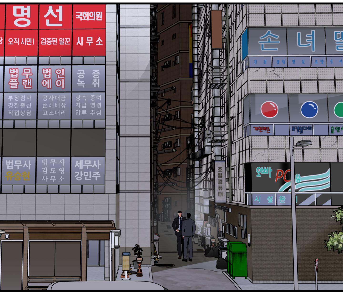 그리고 무엇보다 제가 배경에 넣는 오브제들은 공간의 연식, ‘중앙동’이라는 동네의 낙후성 등의 리얼리티를 높이기 위해서 배치한 것이 대부분입니다. 물론 영화 포스터 같은 경우엔 캐릭터의 성격도 고려하고, 스토리적으로 어울리거나 약간의 복선을 줄 수 있는 영화들을 넣기도 했습니다만 그 외, 체육관이나 빌라에 붙어 있는 전단지, 경기 포스터, 글귀귀와 같은 것들은 특별히 주목해야 할 만큼 큰 의미가 담겨 있지는 않아요. 이런 것들은 장면의 퀄리티나 분위기를 올려주는 MSG 같은 장치들이지, 메인디시는 아닙니다. 정말 중요한 물건이거나 이미지라면 포커스가 될 거고요. 독자분들께서 장면 안의 사소한 부분까지도 찾아봐주시는 것을 볼 때면 정말 기쁘고 언제나 감사하는 마음을 갖고 있습니다만, 사실 중요하게 보시리라 생각하지 못하고 넣은 것이 대부분이기에 더 늦기 전에 양심 고백을 해야 할 것 같았습니다.